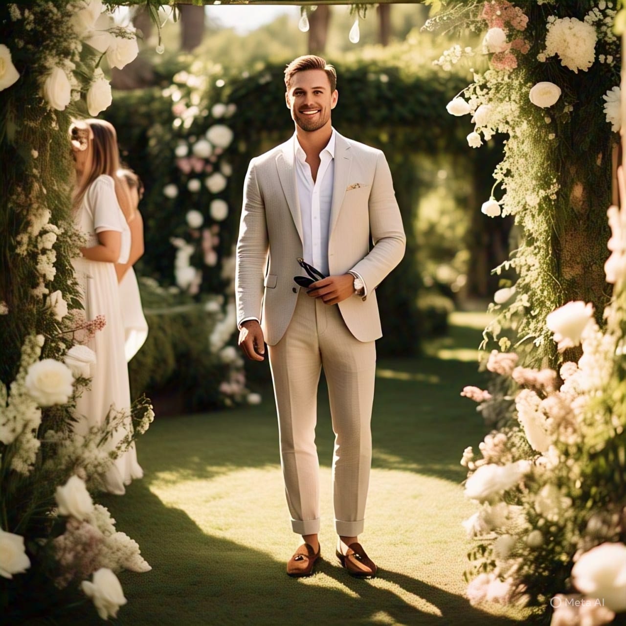 A beige or light grey linen suit paired with a crisp white button-down is a classic and safe bet for any outdoor wedding.